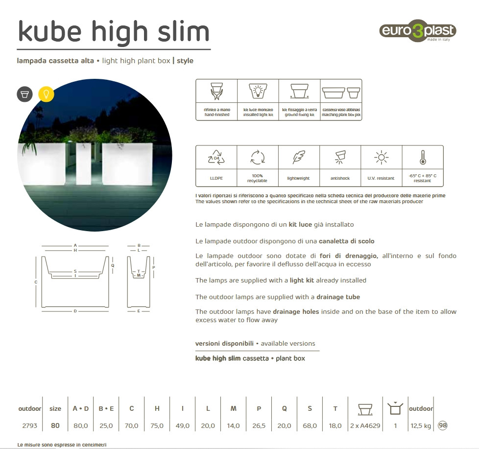 Az Euro3plast KUBE HIGH SLIM Light Cassetta a modern dizájn és a hangulatvilágítás elegáns találkozása. Keskeny, magas kialakítása különösen alkalmas teraszok, bejáratok, folyosók vagy modern enteriőrök vizuális kiemelésére, miközben a beépített világítás meleg, finoman szórt fényt biztosít.