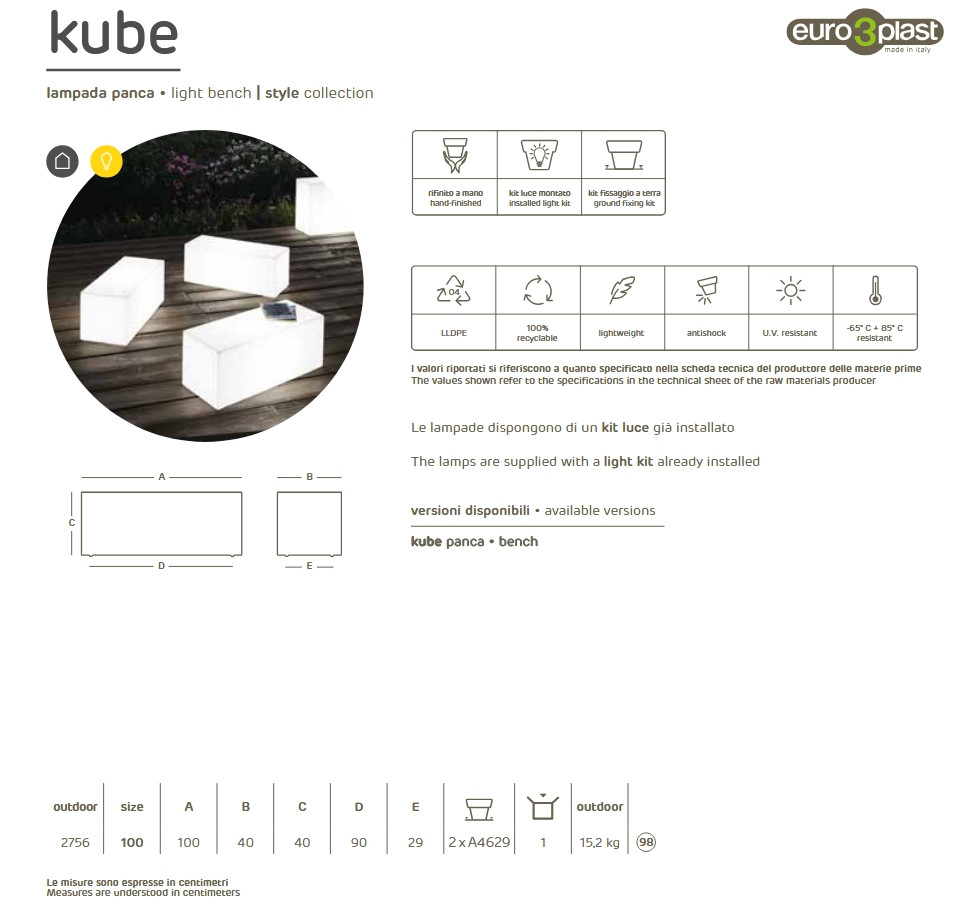 Az Euro3plast KUBE Light Bench egy modern, letisztult formavilágú ülőpad, amely a dizájn és funkció tökéletes kombinációját nyújtja. A KUBE kollekció ikonikus geometrikus stílusát ötvözi hangulatos, homogén fényével, így nappal elegáns bútordarab, éjszaka pedig látványos dekorációs elem.