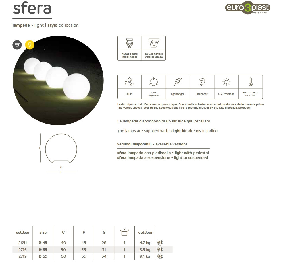 Az Euro3plast SFERA Light a kortárs dizájn egyik legkedveltebb eleme: egy elegáns, homogén fényt kibocsátó világító gömb, amely nappal minimalista dekoráció, éjszaka pedig látványos hangulatfény. Letisztult formájával és időtálló anyagával tökéletes választás minden olyan térhez, ahol a stílus és az atmoszféra egyaránt fontos.